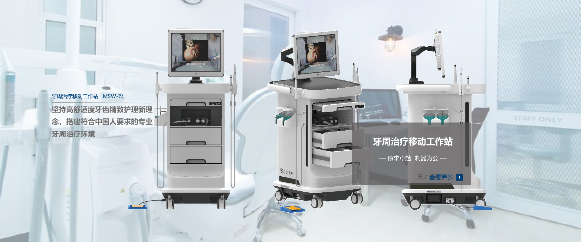 公司致力于磁致伸縮及數字影像技術在口腔醫療器械領域 的應用,目前擁有3項發明專利、5項實用新型專利和2項 外觀專利。公司當前主營產品為牙周治療移動工作站,具 體包括磁致伸縮·超聲潔牙機、高清晰度·數字口腔觀察儀 、全向轉動·多功能移動醫療推車及配套耗材。